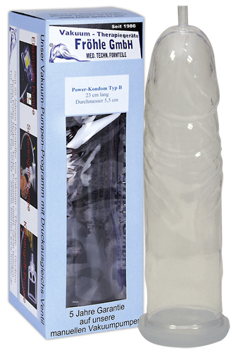 edizinisch-technisch geprüftes Markenprodukt von "Fröhle" zur lokalen Unterdruck-Behandlung des Penis. Beim Patentamt geschützt! Glasklarer Kondom-Zylinder für das gezielte Aufbau-Training des Penis in Länge und Umfang. 23 cm lang, Ø 5,5 cm. Material: PVC/PP.