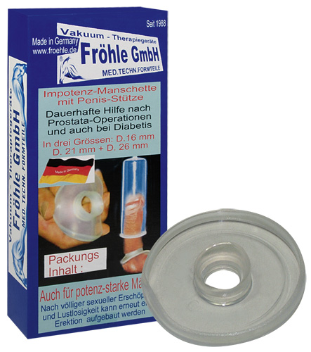 Die Hilfe bei Impotenz. Auch für potenz-starke Männer. Nach dem Training mit einer Fröhle-Erektionspumpe wird die Manschette über den Penis gestreift. So bleibt das venöse Blut, durch die Stützmanschette gestaut, für eine gewisse Zeit in den Schwellkörpern. Auch bei völliger Impotenz kann eine anhaltende Erektion aufgebaut werden. Innen-Ø 16 mm, 21 mm oder 26 mm lieferbar.