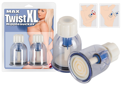 Zwei individuell einstelbare Nippelsauger, die durch Drehen ein starkes Vakuum erzeugen. Gesamtlänge jeweils ca. 11 cm und im Ø 5,8 cm. Material: ABS
