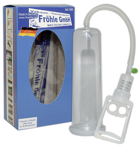 Medizinisch-technisch geprüftes Markenprodukt von "Fröhle" zur lokalen Unterdruck-Behandlung des Penis. Beim Patentamt geschützt! Komplett-Set für das gezielte Aufbau-Training des Penis. Bringt sofort mehr Steife und Stärke in den Penis! Transparenter, anatomisch geformter Vakuum-Zylinder (21 cm lang, Ø 5 cm) komplett mit Steckmanschette, Handpumpe und Druckregler.