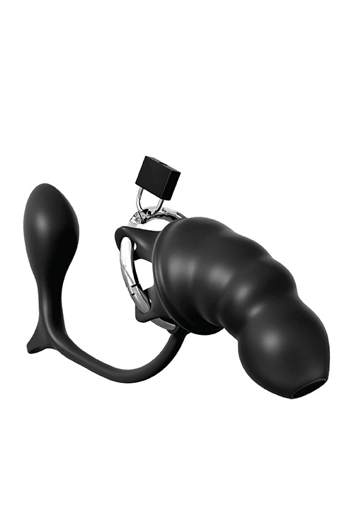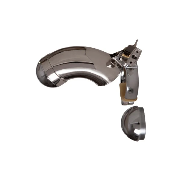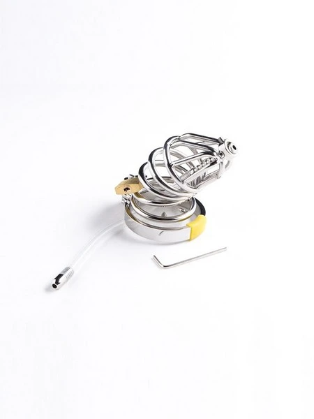 Gefertigt aus Edelstahl und mit einer abnehmbaren Harnröhrentülle aus Silikon, die Flüssigkeit durchlässt, wird der Peniskäfig sowohl innen als auch außen das Kommando übernehmen.