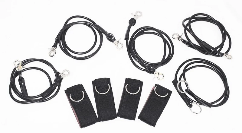 Kragen, Handschellen und Fußfesseln sind ebenfalls verstellbar und haben Ringe, an denen Gewichte, Haken und Seile befestigt werden können.