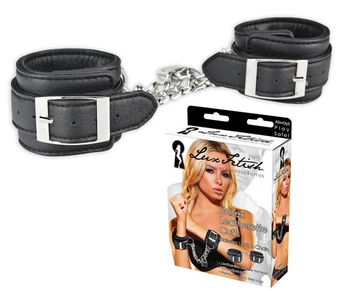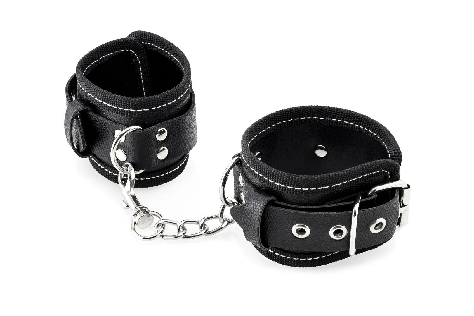 Schwarze Kunstleder-Handschellen, verbunden mit einer silbernen Kette für abenteuerliche Sex-Abenteuer im und neben dem Bett!