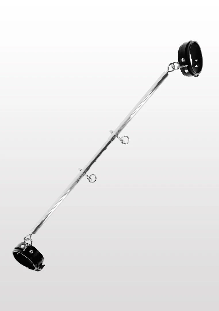 Stabile Spreizstange an deren Enden Hand- und Fußfesseln befestigt werden können. Die mitgelieferten Fesseln aus Lederimitat sind weich gepolstert, lassen sich durch den Klettverschluss frei verstellen und werden über Karabiner an der Stange befestigt. Die kurze Verbindungskette aus Metall kann genutzt werden, um die Fesseln miteinander zu verbinden und sie so auch gesondert zu nutzen.