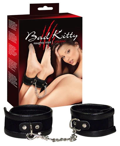 Schwarze Fußfesseln (30x5cm) aus Velours mit Lederimitat eingefasst. Mit Klettverschluss und kurzer Verbindungskette mit Karabiner (ca. 10cm).