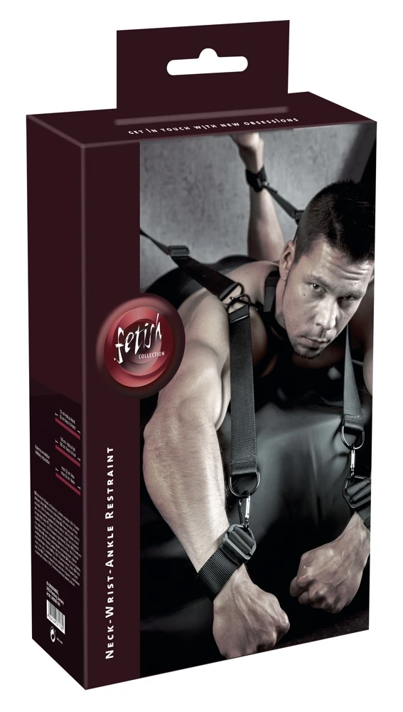 Fesselset bestehend aus Halsfessel (Umfang max. 52 cm) mit D-Ringen seitlich sowie 4 stabilen Webgurten (2 x 33 cm lang, 2 x 90 cm lang) mit Fesselschlaufen an den Enden für Hände und Füße, die sich stufenlos verstellen und per Karabinerhaken befestigen lassen. Textil: 100% Polyester, Metall.