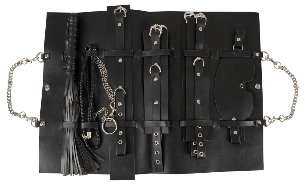 Dieses 11-teilige Bondage Set aus Kunstleder besteht aus verschiedenen BDSM Spielzeugen für sie und ihn.