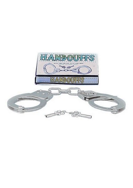 Handschellen mit dreigliedriger Kette verbunden. Zwei Schlüssel. Lässt sich auch ohne Schlüssel über Hebel öffnen.