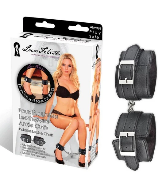 Verstellbare, schwarze Fußfesseln, innen mit Kunstfell gefüttert aus 100% PVC verbunden durch eine schwere Gliederkette mit Schloss, inklusive 2 Schlüsseln.