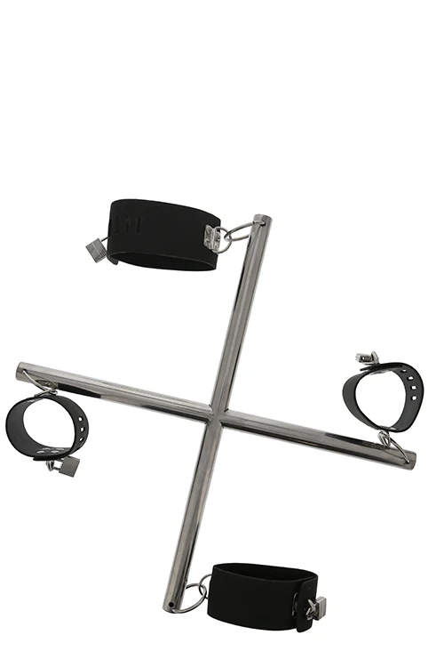 Fesselkreuz mit Hand und Fußfesseln in Lederoptik. Die Manschetten werden am Ende der Metallstange mit Metall-O-Ringen befestigt.Die Manschetten sind leicht in der Größe verstellbar und können mit den mitgelieferten Vorhängeschlössern geschlossen werden.