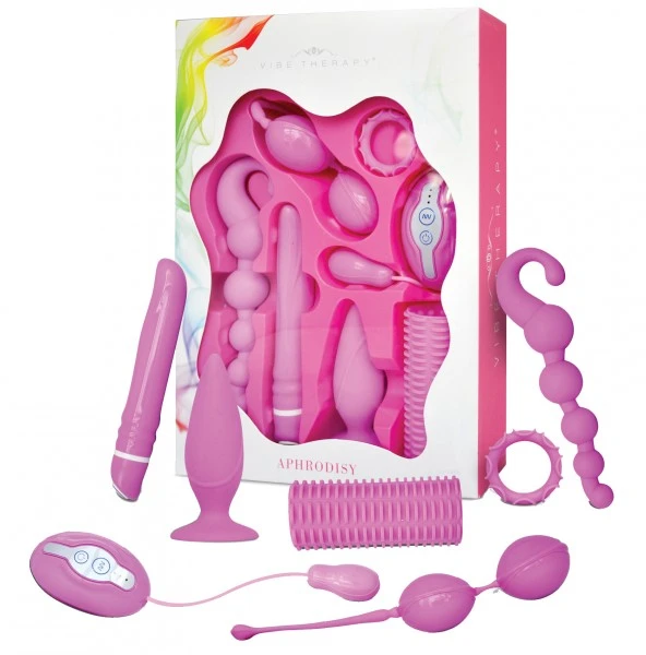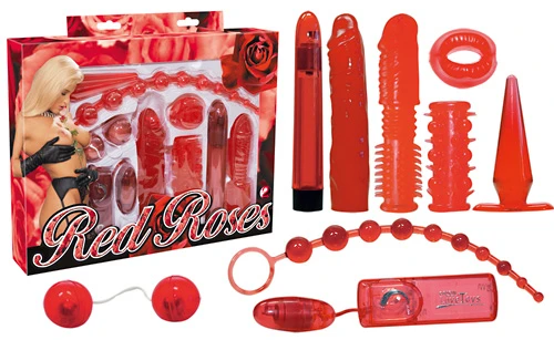 9-teiliges Lust-Set aus rot-transparentem Gleitmaterial. Vibrator (17,5 cm lang, Ø 2-2,5 cm) und eine große Auswahl an vielfältigem Lust-Spielzeug. Stufenlos regelbar. Inklusive Mignon-Batterien.
