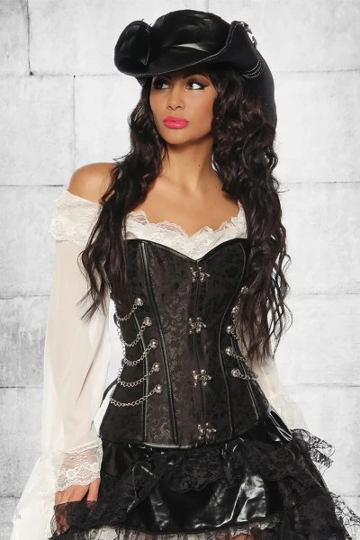 Corsage mit frontalen Haken und Ösen. Hinten geschnürt. Abnehmbare Strapshalter, 6 Stäbe pro Seite. Nicht geeignet zur Schnürung einer Wespentaille. Schwarz. 100% Polyester.