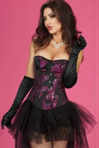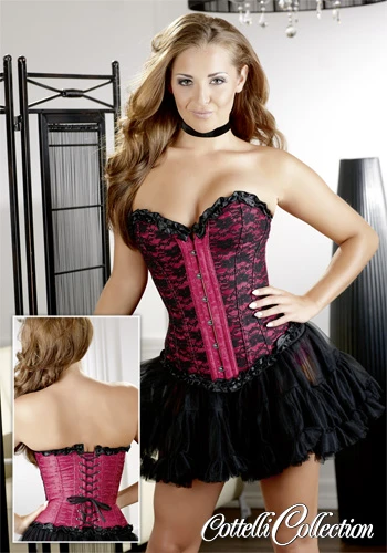 Corsage in der Farbe Brombeer, mit schwarzer Spitze überzogen. Vorne mit Haken und Ösen, hinten mit Schnürung (nicht zur Taillenreduktion geeignet). Mit Rüschenverzierung am Dekolleté und Saum. 50% Polyester, 50% Polyamid. Innenfutter 100% Polyester. Ohne Strümpfe.
