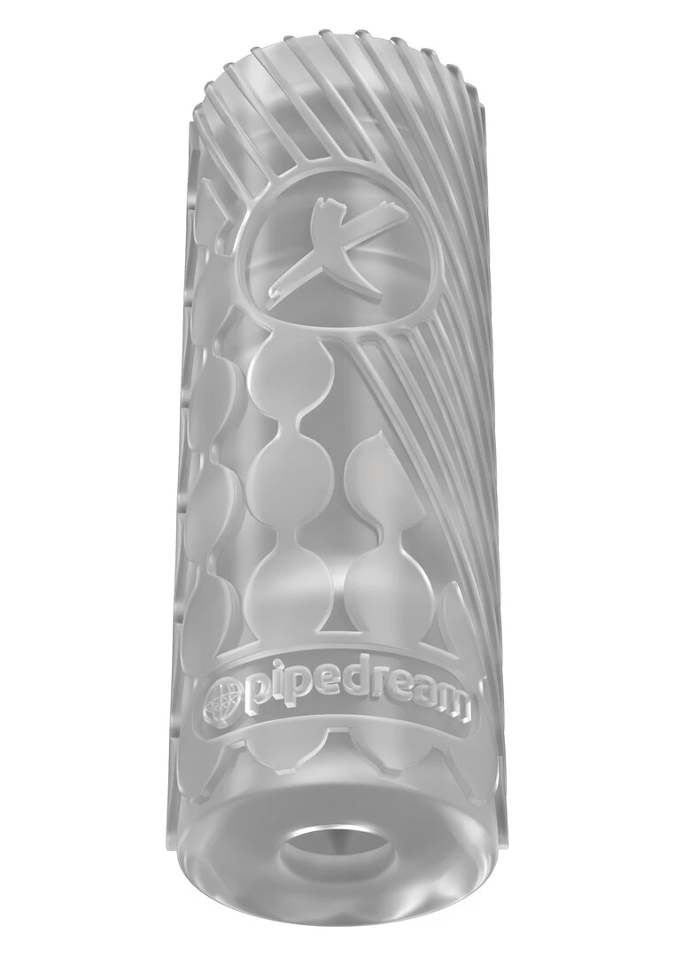 Transparenter, wiederverwendbarer Masturbator mit integrierter Spule, die bei Penetration den Masturbator ins Drehen versetzt (Internal Coil Mechanism). Ausgeprägt reizstrukturierter Lustkanal. 13 cm lang, Ø 4,5 cm. Elastomer (Silikon), PP, PS, PE. Inklusive Trockengehäuse (nach Reinigung).