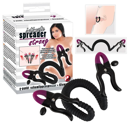 Die Klemmen werden an die Schamlippen geklammert, um sie zu spreizen und die Klitoris freizulegen. Die Intensität der Klemmstärke lässt sich mittels der Stellschrauben von zart bis hart regulieren...