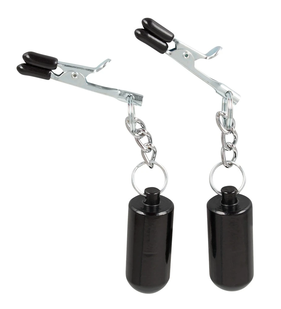 Diese schwarz/silbernen Brustgewichte sehen geil aus und sorgen für erregend prickelnde Trage-Gefühle. Mit soft gezahnten Nippel-Clips unter den abnehmbaren Kunststoff-Schonbezügen. Auch z.B. an Schamlippen und Hoden tragbar.