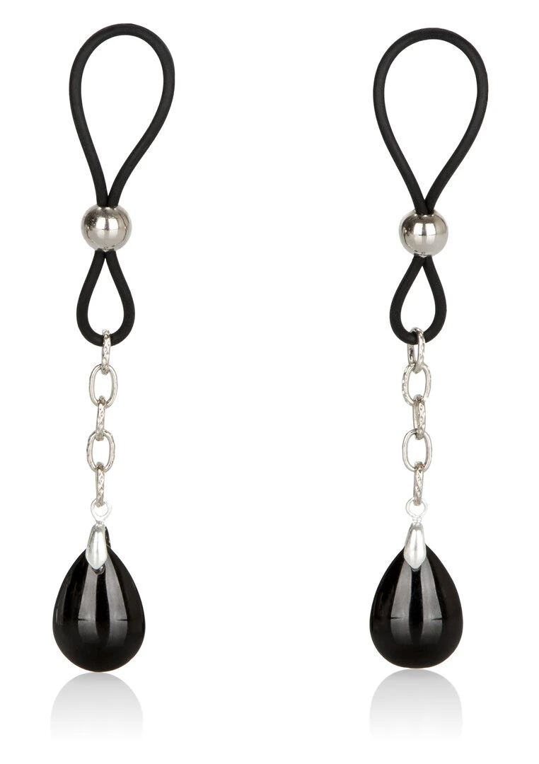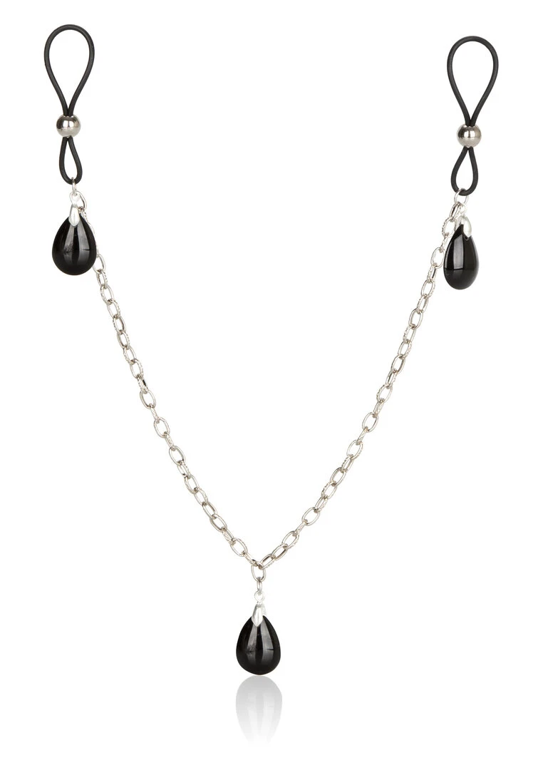 Das Set besteht aus 2 verstellbaren Brustwarzenschlaufen aus weichem und superdehnbarem Silikon. Die Schlaufen im Cinch-Design messen 2,5 Zoll/6,25 cm und verfügen über silberfarbene Perlenversteller, die nach oben und unten gleiten, um einen einfachen und sicheren Halt der Brustwarze zu gewährleisten. An den Schlaufen baumelt eine nicht anlaufende, nickelfreie Eisenkette, die mit einem Trio aus tropfenförmigen Onyxkristallen verziert ist.