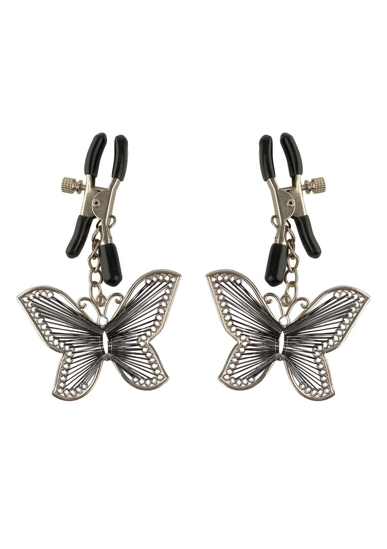 2 Nippelklemmen mit Anhängern in Form eines Schmetterlings. Die Klemmen drücken errregend die Nippel zusammen. Der Druck läßt sich mit den Schrauben nach den individuellen Bedürfnissen einstellen.
