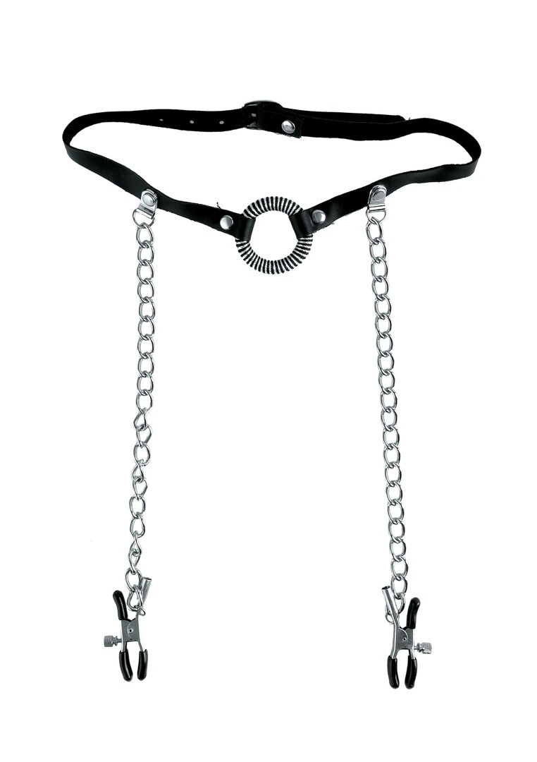 Ball Gag mit Nippelklemmen. Mit einstellbarem Band und verstellbaren Nippelklemmen. Material: Kunstleder (PU), Silikon, Metall.