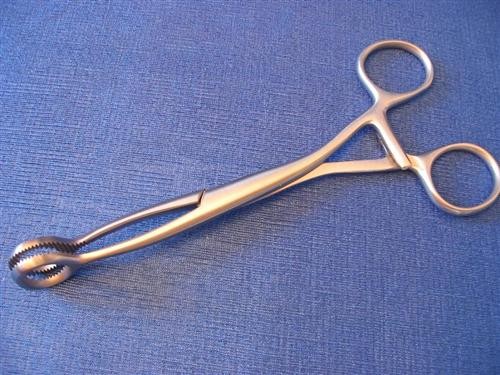 Zungen-Fasszange mit Scherengriff und Rastersperre. Vorne mit gerieften Ringen für sicheres Herausziehen und Festhalten der Zunge.