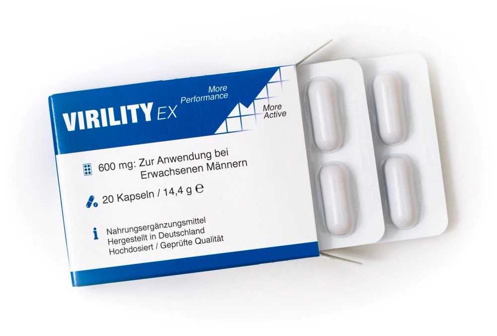 Veganes Nahrungsergänzungsmittel Virility Ex speziell für den Mann mit einer natürlichen Alternative aus ausgewählten Extrakten in einer komplexen Formel. Eine Kapsel enthält 600 mg Extraktmischung aus 6 Zutaten: