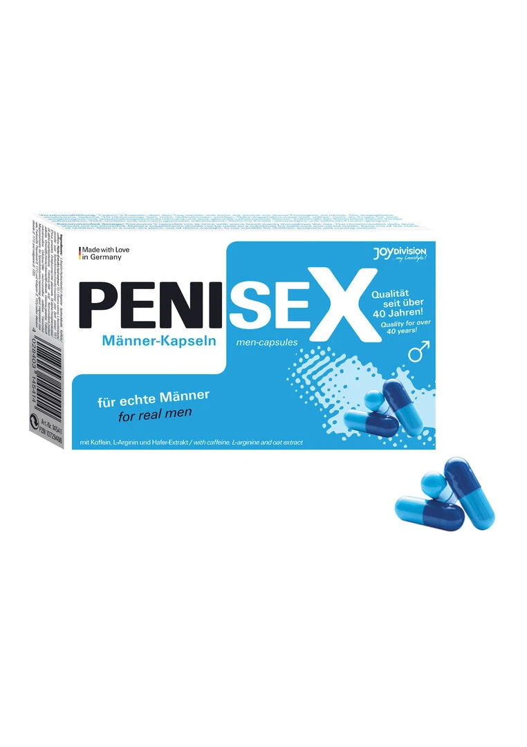 PENISEX Männer-Kapseln sind ein Nahrungsergänzungsmittel entwickelt speziell für IHN – zur ernährungsspezifischen Unterstützung der Sexualität. PENISEX Männer-Kapseln enthalten u. a. Koffein, Pflanzenextrakte, Vitamine und Spurenelemente. Koffein kann die körperliche Ausdauer und Leistungsfähigkeit steigern, während Folsäure zur Verringerung von Müdigkeit und Ermüdung beiträgt. Das Spurenelement Chrom trägt zu einem normalen Stoffwechsel von Makronährstoffen bei. Selen trägt zur einer normalen Spermabildung und Zink sowohl zur normalen Funktion des Immunsystems als auch zur Aufrechterhaltung eines normalen Testosteronspiegels im Blut bei. Vitamin C trägt sowohl zu einer Verringerung von Müdigkeit und Ermüdung, als auch zu einem normalen Energiestoffwechsel bei.